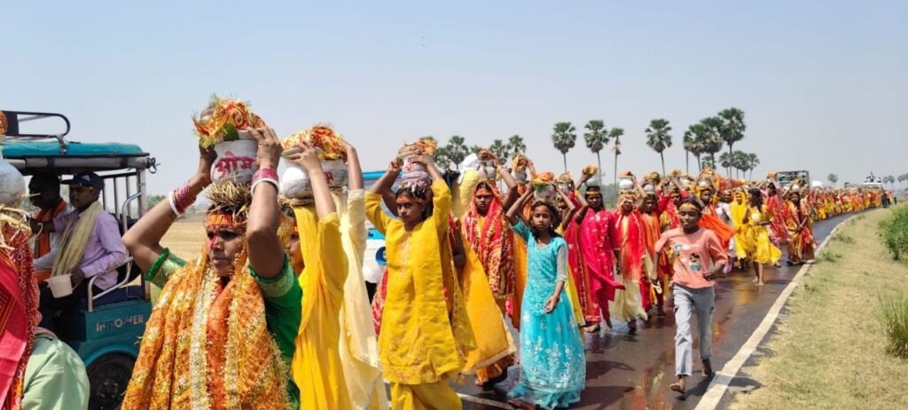 उसके बाद वाराणसी से पधारे यज्ञाचार्य सच्चिदानंद पांडे ने मुख्य जजमान समेत श्रद्धालु को विधिवत कल्श में जल भरवाया।तद उपरांत श्रद्धालुओं ने इस भीषण गर्मी में तपती धूप में नंगें पांव सर पर रख कल्श रखकर भक्ति गीतों के धुन पर बनवारीपुर मोरा, मुर्गीयाचक, मोबारकपुर होते हुए पचौरा गांव स्थित धार्मिक कार्यक्रम स्थल परिसर में पहुंचे एवं यशशाला को परिक्रमा करते हुए कल्श को स्थापित की ।इस दौरान रास्ते में जय मां दुर्गे ,मां जगदम्बे आदि जयकारे की घोष से इलाके भक्ति रहा।वहीं वाराणसी से पधारे यज्ञाचार्य श्री पांडेने बताया कि तीन दिवसीय धार्मिक अनुष्ठान में मंगलवार को कलश यात्रा का अनुष्ठान चला।