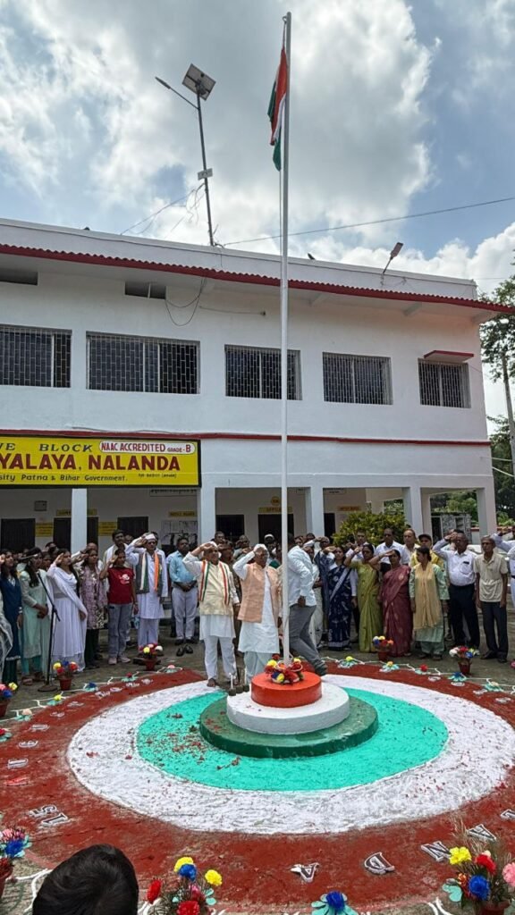 बिहारशरीफ। महाबोधि महाविद्यालय, नालंदा में 79वें स्वतंत्रता दिवस के अवसर पर देशभक्ति और उत्साह का अद्भुत संगम देखने को मिला। महाविद्यालय परिसर में आयोजित मुख्य समारोह में शासी निकाय के सचिव राजेंद्र प्रसाद एवं प्राचार्य डॉ. अरविंद कुमार ने संयुक्त रूप से ध्वजारोहण किया। तिरंगे के शान से लहराते ही पूरा वातावरण “वंदे मातरम्” और “भारत माता की जय” के नारों से गूंज उठा।