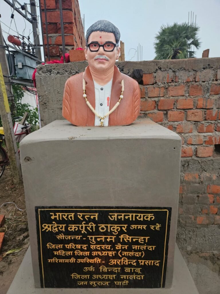 बिहारशरीफ (अपना नालंदा)।आज रविवार को जननायक कर्पूरी ठाकुर की स्मृति में आयोजित एक सम्मानजनक कार्यक्रम में उनकी प्रतिमा का अनावरण कर भावभीनी श्रद्धांजलि अर्पित की गई। यह आयोजन पूनम सिन्हा (जिला परिषद सदस्य, बेन एवं महिला जिला अध्यक्ष, जन सुराज पार्टी नालंदा) के सौजन्य से संपन्न हुआ।